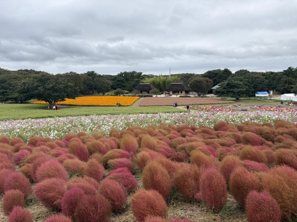 2日目は国営ひたち海浜公園に行ってコキアやコスモスの花を見にいきました。丘のようになっていてその場所に満遍なくコキアやコスモスの花が咲いていてとても壮観でした。