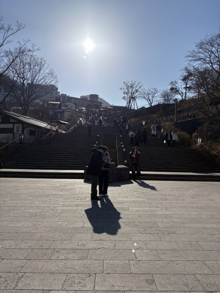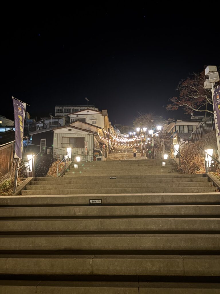友達とは初めての温泉街旅行でした。石段が365段あり、365日繁盛しますようにとの願いが込められているようです。階段の両隣にはたくさんのお店があり、食べ歩きができるようになっています。